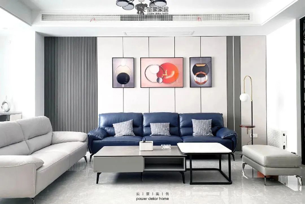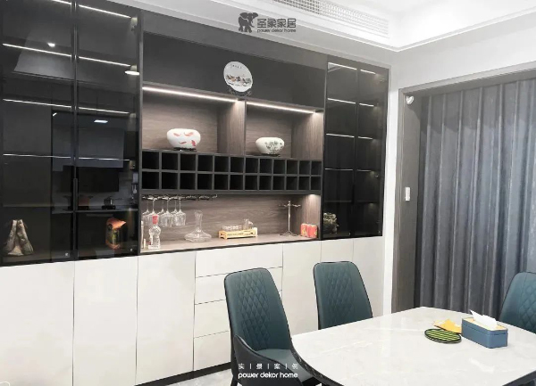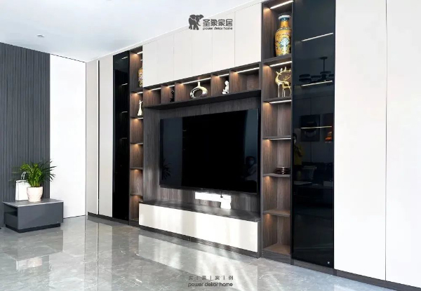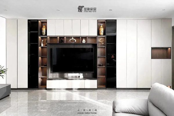 客廳電視柜采用鋅灰為柜體板,門板為米夏灰,搭配黑玻門板,置頂柜體拉伸空間感,整體空間高端開闊,空間收納展示功能性強(qiáng)。