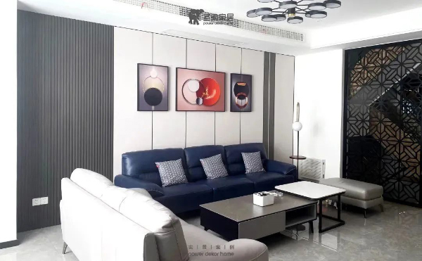 沙發(fā)背景墻與電視柜呼應(yīng),采用米夏灰墻板,同時(shí)搭配仿古木格柵,凸顯客廳的高格調(diào)。