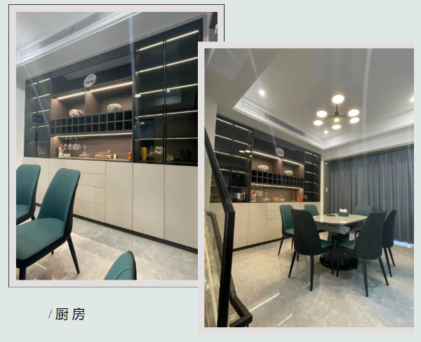 餐廳空間餐邊柜采用鋅灰做柜體板,米夏灰為門板。柜體對稱式結(jié)構(gòu),酒具物品收納擺放一應(yīng)俱全。