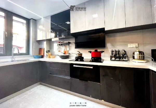 廚房空間采用「圣象家居全屋定制琥珀系列」,最佳的U型地柜結(jié)構(gòu),空間布局合理。地柜門板為N19深鐵巖,吊柜門板為N14淺鐵巖,均為PET新型材質(zhì)高環(huán)保,油污極易清潔。