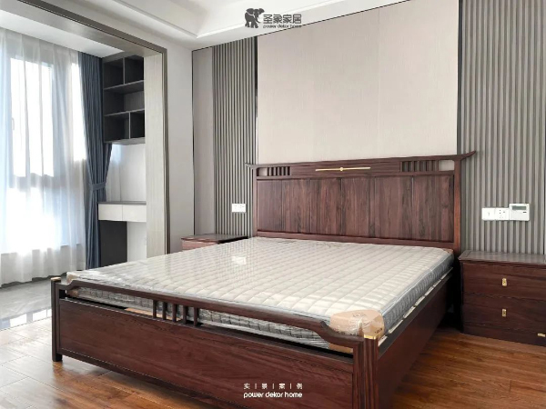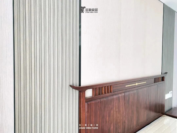 主臥空間簡潔舒適,床頭背景墻對稱式結(jié)構(gòu),格柵與護(hù)墻板的組合,延伸空間感。主臥陽臺(tái)設(shè)計(jì)小型書柜,可做辦公桌使用,提升空間功能。