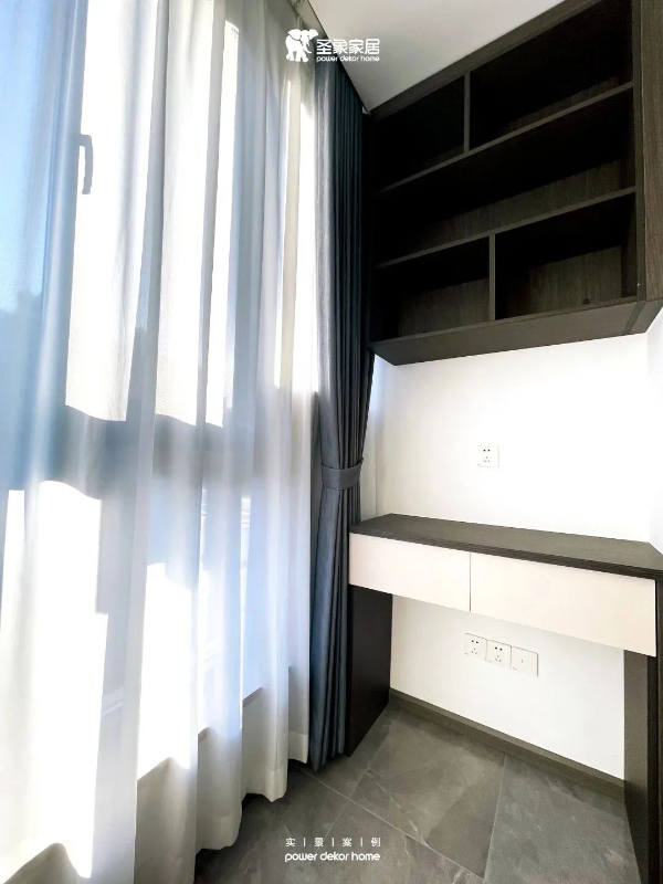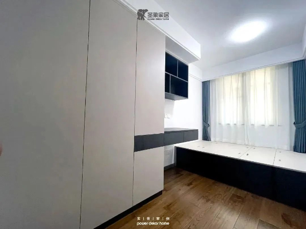 榻榻米依窗而建,底部收納性強(qiáng)。置頂衣柜延伸設(shè)計(jì)辦公桌,頂部開放式層板可擺放書籍文件。
