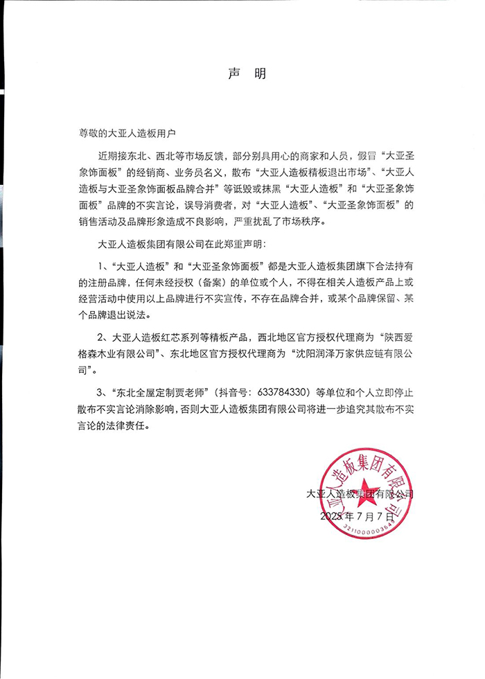 3、“東北全屋定制賈老師”(抖音號:633784330)等單位和個人立即停止散布不實(shí)言論消除影響,否則大亞人造板集團(tuán)有限公司將進(jìn)一步追究其散布不實(shí)言論的法律責(zé)任。