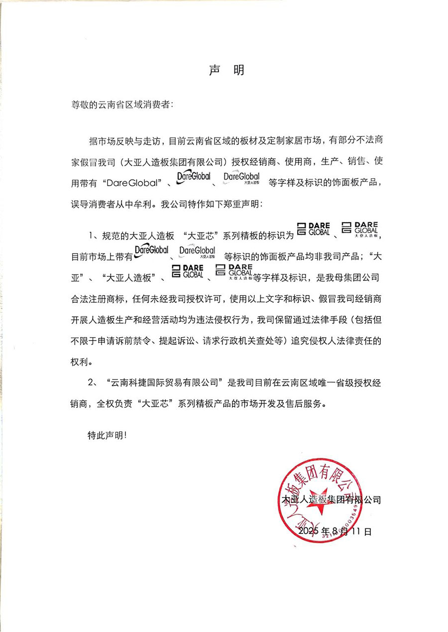 據(jù)市場(chǎng)反映與走訪,目前云南省區(qū)域的板材及定制家居市場(chǎng),有部分不法商家假冒我司(大亞人造板集團(tuán)有限公司)授權(quán)經(jīng)銷商、使用商,生產(chǎn)、銷售、使用帶有“DareGlobal”、