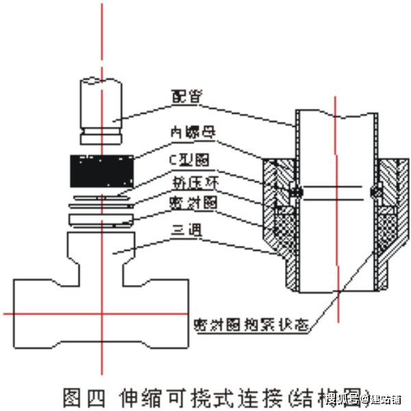 ①伸縮可撓式(圖四):配管插入管件承口,緊固內(nèi)螺母,通過擠壓環(huán)使密封圈受壓起密封作用的連接方式。