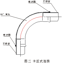 ①卡壓式:配管插入管件承口(承口內(nèi)帶有橡膠密封圈)后,用專用工具壓緊管口而起密封和緊固作用的連接方式。(圖二)