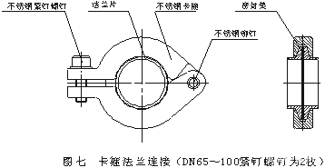 ③卡箍法蘭,不銹鋼“二哈夫”卡箍與法蘭片以錐形槽配合,兩法蘭片間襯有密封墊,用緊定螺釘緊固。(圖七)
