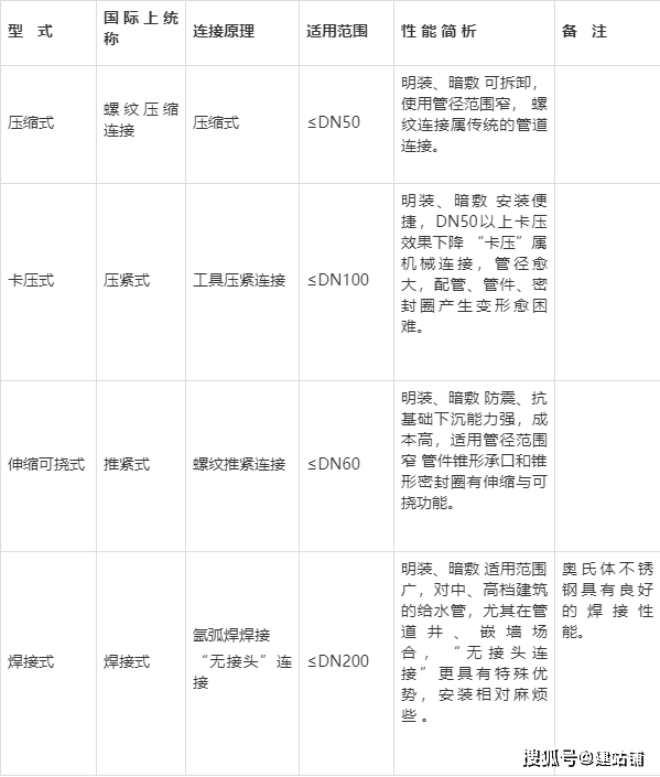 ①薄壁不銹鋼管,目前國(guó)內(nèi)在建筑給水管道應(yīng)用較多的有卡壓式、焊接式等若干種連接方式,按收集的資料匯總見表三。