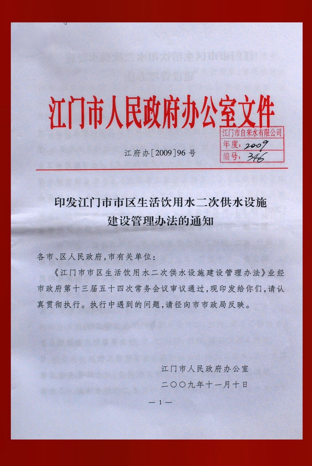 《管理辦法》明確新的二次供水設施必須移交供水企業(yè),并由開發(fā)商一次性移交供水設施管理費用。對于新建的二次供水設施,江門公用水務嚴格按照規(guī)范要求組織審查驗收,對各種驗收資料及調試運行等進行細致檢查,對不合格的項目督促開發(fā)商及時整改,整改合格后方可交付營運使用。