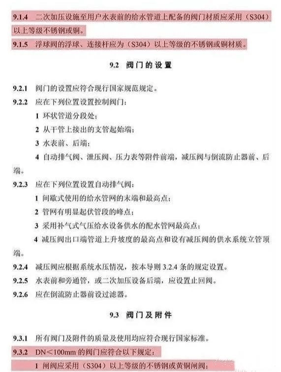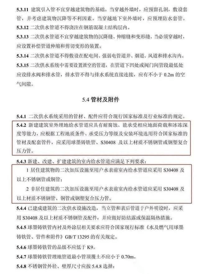 新的《導(dǎo)則》共分十五章,主要內(nèi)容有:總則、術(shù)語、涉及總要求、室外管道、二次供水方式、泵房及水泵、水箱(池)及水質(zhì)保障、管材及配件、閥門、水表及給水管道、電氣與自動檢測設(shè)備、施工及安裝、節(jié)水與節(jié)能、驗收、運營與管理。其中第八章,對管材及配件做出了明確規(guī)定:
