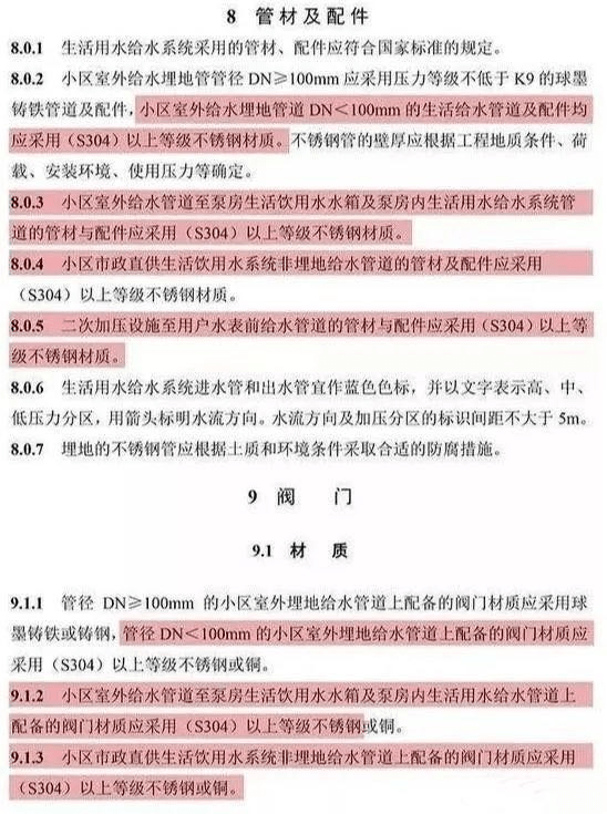 8.0.3 小區(qū)室外給水管道至泵房生活飲用水水箱及泵房內(nèi)生活用水給水系統(tǒng)管道的管材與配件 應(yīng)采用(S304)以上等級不銹鋼材質(zhì)。