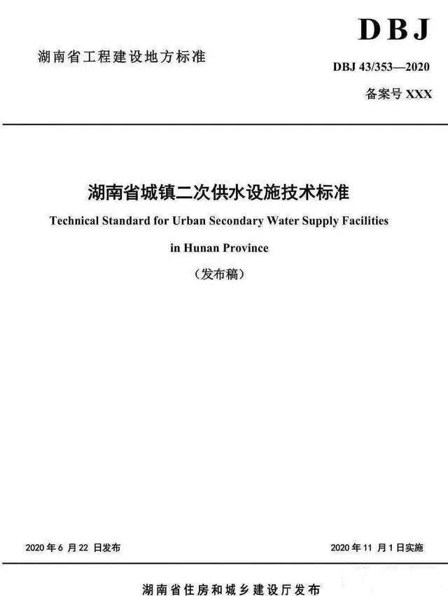 《湖南省城鎮(zhèn)二次供水設(shè)施技術(shù)標(biāo)準(zhǔn)》標(biāo)準(zhǔn)已由我廳組織專家審定通過,現(xiàn)批準(zhǔn)為湖南省工程建設(shè)推薦性地方標(biāo)準(zhǔn)。湖南省建筑設(shè)計院有限公司、湖南省城鄉(xiāng)建設(shè)行業(yè)協(xié)會、上海威派格智慧水務(wù)股份有限公司主編的《湖南省城鎮(zhèn)二次供水設(shè)施技術(shù)標(biāo)準(zhǔn)》編號為DBJ43/T353-2020,原《城市二次供水設(shè)施技術(shù)規(guī)范》(DBJ43/002-2009)同時廢止。標(biāo)準(zhǔn)自2020年11月1日起在全省范圍內(nèi)實施,由湖南省住房和城鄉(xiāng)建設(shè)廳負(fù)責(zé)管理,由主編單位負(fù)責(zé)標(biāo)準(zhǔn)具體技術(shù)內(nèi)容的解釋。
